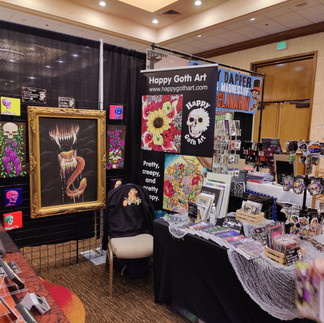 I paid for a larger 8x8ft space. I always have to much stuff to display, which causes problems with people seeing what is actually there. With the larger space, I was able to hang a lot of original art on a "wall" as well as on a table. There was enough space for things to be seen and also space for the customer's eyes to process what they had seen. I also had some space for prints and stickers. They were not my top sellers, but they were not crowding the originals and had their own space to exist.